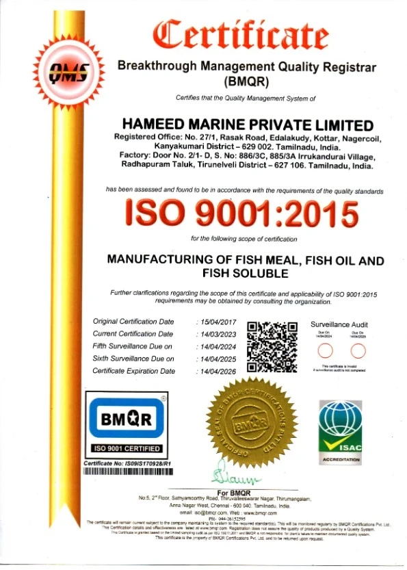 Hameed Marine holds six international certifications: GMP+ International (B2 scope), ISO 9001:2015, ISO 2000:2018, ISO 14001:2015, HACCP, and SGS ISO 22000. These are not marketing credentials. They are the management systems that govern our plant operations every day - documented, trained against, monitored, and verified by accredited third-party auditors on annual unannounced surveillance visits.