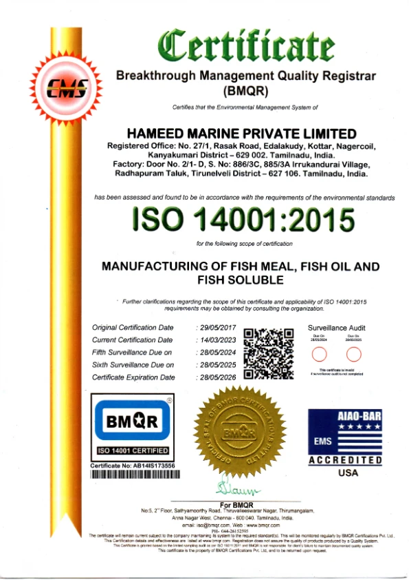 Hameed Marine's five certifications answer all of these. GMP+ B2 and FSSC 22000 cover feed safety and food safety management. ISO 9001:2015 covers quality management. ISO 14001:2015 standard offers a structured roadmap to proactively control environmental footprints and drive continuous performance improvement. HACCP identifies and controls the critical production hazards.